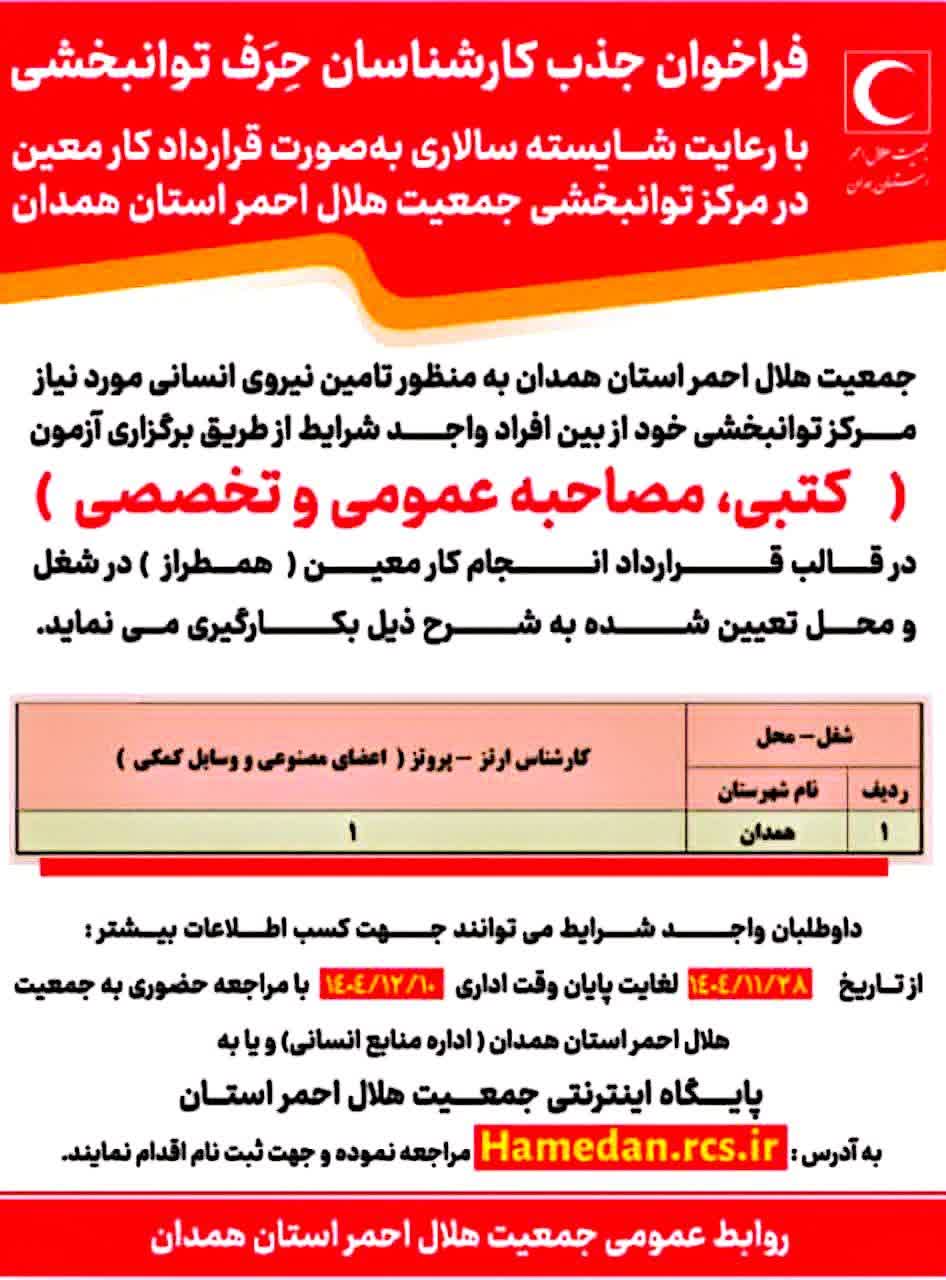 جمعیت هلال احمر استان همدان به منظور تامین نیروی انسانی مورد نیاز مرکز توانبخشی خود از بین افراد واجد شرایط از طریق برگزاری آزمون (کتبی، مصاحبه عمومی و تخصصی) در قالب قرارداد انجام کار معین (همطراز) در شغل و محل تعیین شده مندرج در جدول بکارگیری مینماید.